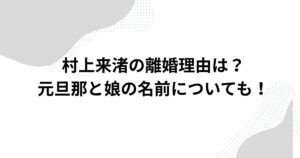 村上来渚の離婚理由は?元旦那と娘の名前についても! 元アイドルで現在はシングルマザーとして活動している村上来渚さんについて、「離婚」に関する情報を整理したいと考える人は少なくありません。 村上来渚さんは結婚、出...