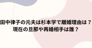田中律子の元夫は杉本学で離婚理由は?現在の旦那や再婚相手は誰? 女優としてだけでなく、ヨガインストラクターとしても活躍している田中律子さん。 1997年に元夫の杉本学さんと結婚し、一人娘をもうけましたが、2012年に離婚を発表しま...