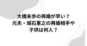 大橋未歩の再婚が早い?元夫・城石憲之の再婚相手や子供は何人? アナウンサーとして高い人気を誇る大橋未歩さんは、これまでに2度の結婚を経験しています。 最初の結婚相手は、元プロ野球選手の城石憲之さんでした。 大橋未歩さんと元...