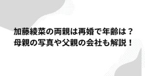 加藤綾菜の両親は再婚で年齢は?母親の写真や父親の会社も解説! 加藤綾菜さんは、俳優の加藤茶さんの妻として注目を集める一方で、自身の家族や育った環境にも関心が寄せられています。 明るく前向きな性格で知られる加藤綾菜さんです...
